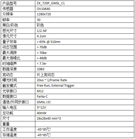 功能:GMSL相机 GMSL1 720P