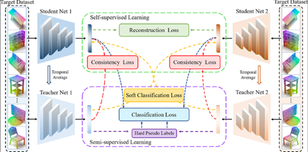 彭小江和李青提出了一种新的解决方案——图注意力双重集成学习(GRADE)框架。这一方法通过在源数据上进行初步训练,在目标数据上建立两个协作训练分支(教师-学生模型),每个分支构建一个时间平均教师模型,并将其生成的伪标签传递给另一个分支。这种合作不仅捕捉高级语义信息,还提高了网络的一致性泛化能力和准确重建能力。为了使教师模型生成更可靠的标签,该方法改进了现有的DGCNN架构,加入了动态图注意力模块,从而更好地挖掘局部邻域点之间的关系。
